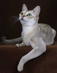 The Singapura cats originate from a small region of Singapore where they are known as the 'drain cat'. The description belies its beauty. It is a very dainty cat, being the smallest breed, but is in fact a big cat in a small body. It was discovered by an American couple, Hal and Tommy Meadow in the 1970's and was imported into the States by the Meadows. They were eventually imported into the UK in the late 1980's but it was not until the 1990's that they started to become popular. Once they were on exhibition at shows, their popularity increased considerably, due to their endearing looks and nature and being very affectionate. The GCCF now recognise them and they have now completed all the requirements to compete to win championship titles. They only have small litters but are great fun.