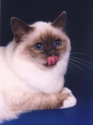 'JJ' had a great kitten career, winning her Open Class 6 times and Best of Breed 6 times, plus 15 First Prizes in miscellaneous classes. She was Best in Show Kitten at the Kensington Kitten & Neuter and South Western Counties Shows. JJ was the Birman Cat Clubs' Best Blue Point Kitten for 1999. Her debut as an adult was made at the 1999 Supreme Show where, following in her mother's footsteps, she won her first Challenge Certificate amid strong competition. Her 2nd Certificate came at her next show, the Maidstone & Medway but after that, with the tremendous number of quality blue points being shown, she had to wait until the Essex on 1st April 2000 to win her 3rd Certificate and her Champion title. In 2007 shown as a neuter, JJ became an Imperial Grand Premier.